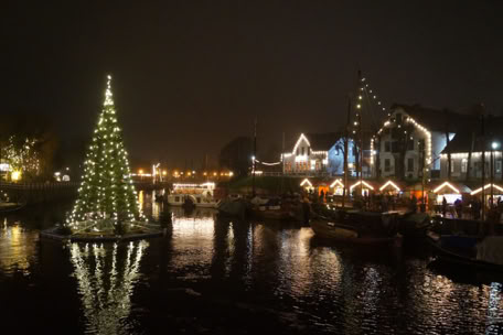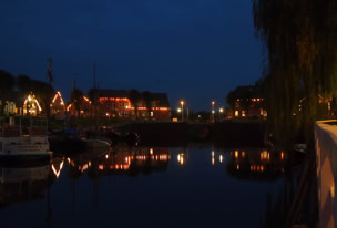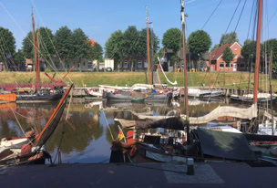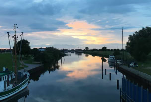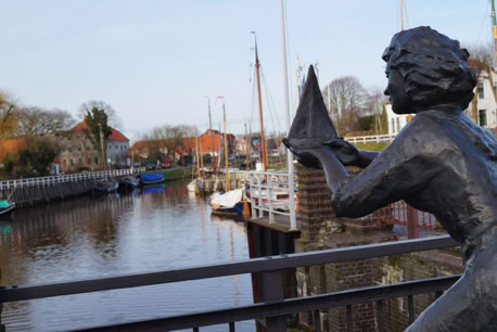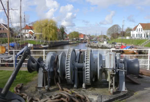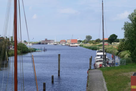 Weiter der Harle entlang kommen Sie zur Friedrichschleuse mit seiner Klappbrücke im holländischen Stiel. Kurz vor dem Yachthafen sehen Sie die „Seeperlen“. Das sind Häuser, die direkt auf der Harle erbaut wurden.